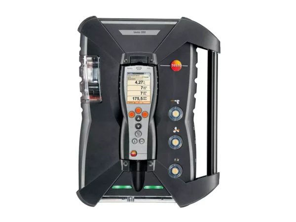 - La caja analizadora testo 350 es necesaria para la ejecución de la medición de emisiones ya que está contenida todo el sistema de sensores y el sistema electrónico. La caja analizadora testo 350 contiene de forma estándar un sensor de gas de O2, sin embargo, para la puesta en marcha tiene que estar conectado, como mínimo, un sensor (apto para el funcionamiento con máximo 6 sensores). Al conectar los sensores opcionales es posible seleccionar entre sensores de gas para CO, CO2, NO, NO2, SO2, H2S o CxHy.
