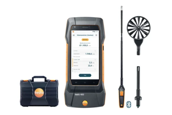 - En el set: Medidor para climatización universal testo 400, sonda de molinete de 16 mm (con empuñadura Bluetooth® y telescopio), cabezal de la sonda de molinete (Ø 100 mm), cabezal de la sonda de temperatura y humedad de alta precisión, ángulo de 90°, maletín