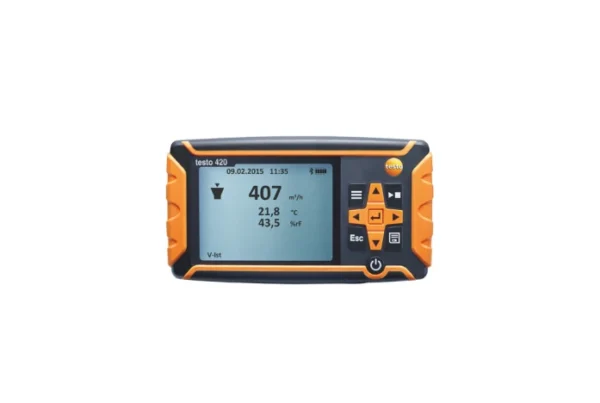 El testo 420 calcula la velocidad de flujo y el caudal volumétrico. Además, el instrumento de medición permite una medición de la presión absoluta.