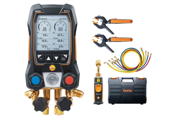 - En el set: Analizador digital de refrigeración inteligente testo 557s incl. Bluetooth y bloque de válvulas de 4 vías, 1 sonda de vacío inalámbrica testo 552i (Bluetooth), 2 sondas de temperatura inalámbricas de pinza testo 115i (Bluetooth, NTC), juego de 4 tubos flexibles de llenado, maletín