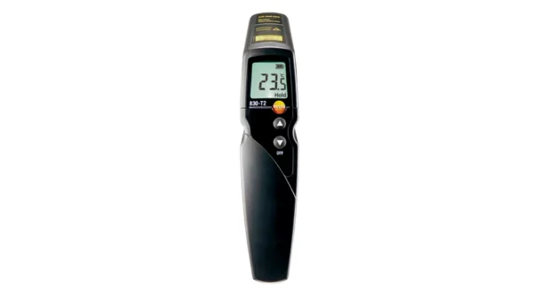El termómetro por infrarrojos testo 830-T2 permite una medición sin contacto de la temperatura de superficies de forma precisa y rápida (2 mediciones por segundo). El termómetro por infrarrojos ofrece las siguientes ventajas: